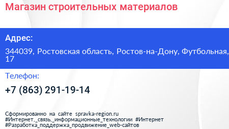 Магазин строительных материалов по адресу 344039, Ростовская область, Ростов-на-Дону, Футбольная, 17 в дальнейшем Организация, размещена в следующих категориях: