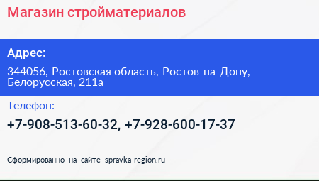 Магазин стройматериалов по адресу 344056, Ростовская область, Ростов-на-Дону, Белорусская, 211а в дальнейшем Организация, размещена в следующих категориях: