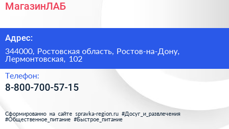 МагазинЛАБ по адресу 344000, Ростовская область, Ростов-на-Дону, Лермонтовская, 102 в дальнейшем Организация, размещена в следующих категориях: