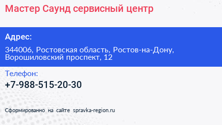 Мастер Саунд, сервисный центр по адресу 344006, Ростовская область, Ростов-на-Дону, Ворошиловский проспект, 12 в дальнейшем Организация, размещена в следующих категориях: