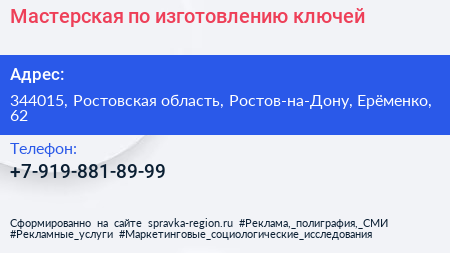 Мастерская по изготовлению ключей по адресу 344015, Ростовская область, Ростов-на-Дону, Ерёменко, 62 в дальнейшем Организация, размещена в следующих категориях:
