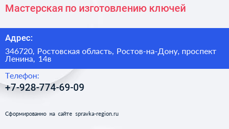Мастерская по изготовлению ключей по адресу 346720, Ростовская область, Ростов-на-Дону, проспект Ленина, 14в в дальнейшем Организация, размещена в следующих категориях: