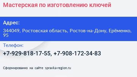Мастерская по изготовлению ключей по адресу 344049, Ростовская область, Ростов-на-Дону, Ерёменко, 95 в дальнейшем Организация, размещена в следующих категориях: