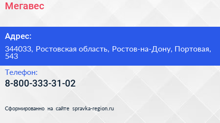 Мегавес по адресу 344033, Ростовская область, Ростов-на-Дону, Портовая, 543 в дальнейшем Организация, размещена в следующих категориях: