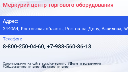 Меркурий, центр торгового оборудования по адресу 344064, Ростовская область, Ростов-на-Дону, Вавилова, 56 в дальнейшем Организация, размещена в следующих категориях: