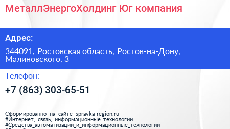 МеталлЭнергоХолдинг Юг, компания по адресу 344091, Ростовская область, Ростов-на-Дону, Малиновского, 3 в дальнейшем Организация, размещена в следующих категориях:
