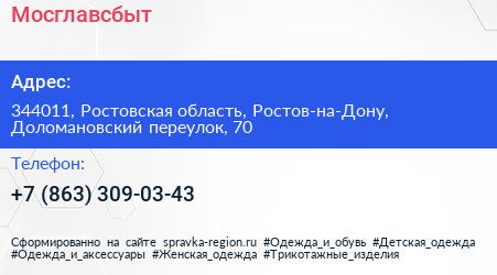 Мосглавсбыт по адресу 344011, Ростовская область, Ростов-на-Дону, Доломановский переулок, 70 в дальнейшем Организация, размещена в следующих категориях: