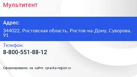 Мультитент по адресу 344022, Ростовская область, Ростов-на-Дону, Суворова, 91 в дальнейшем Организация, размещена в следующих категориях: