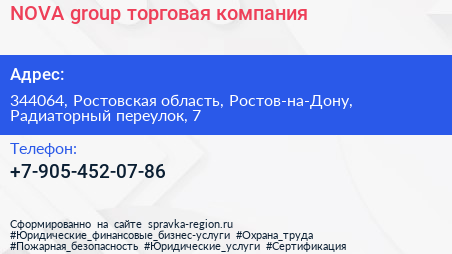 NOVA-group, торговая компания по адресу 344064, Ростовская область, Ростов-на-Дону, Радиаторный переулок, 7 в дальнейшем Организация, размещена в следующих категориях: