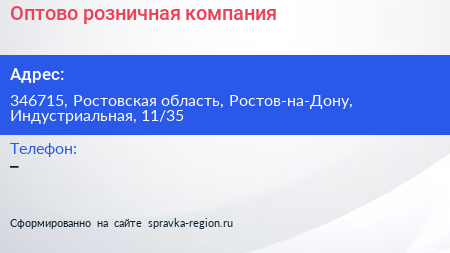 Оптово-розничная компания по адресу 346715, Ростовская область, Ростов-на-Дону, Индустриальная, 11/35 в дальнейшем Организация, размещена в следующих категориях:
