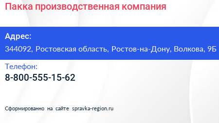 Пакка, производственная компания по адресу 344092, Ростовская область, Ростов-на-Дону, Волкова, 9Б в дальнейшем Организация, размещена в следующих категориях: