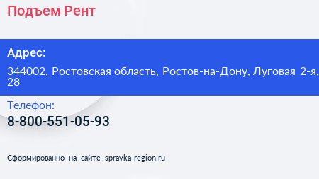 Подъем Рент по адресу 344002, Ростовская область, Ростов-на-Дону, Луговая 2-я, 28 в дальнейшем Организация, размещена в следующих категориях: