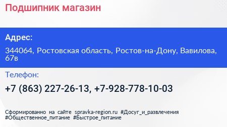 Подшипник, магазин по адресу 344064, Ростовская область, Ростов-на-Дону, Вавилова, 67в в дальнейшем Организация, размещена в следующих категориях: