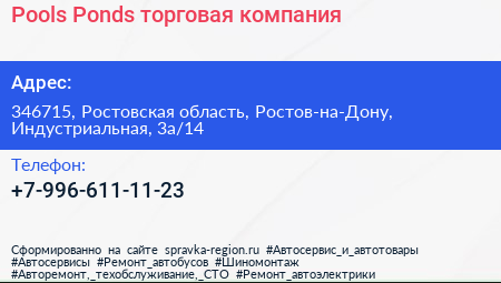 Pools & Ponds, торговая компания по адресу 346715, Ростовская область, Ростов-на-Дону, Индустриальная, 3а/14 в дальнейшем Организация, размещена в следующих категориях: