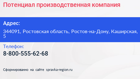 Потенциал, производственная компания по адресу 344091, Ростовская область, Ростов-на-Дону, Каширская, 5 в дальнейшем Организация, размещена в следующих категориях: