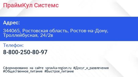ПраймКул Системс по адресу 344065, Ростовская область, Ростов-на-Дону, Троллейбусная, 24/2в в дальнейшем Организация, размещена в следующих категориях: