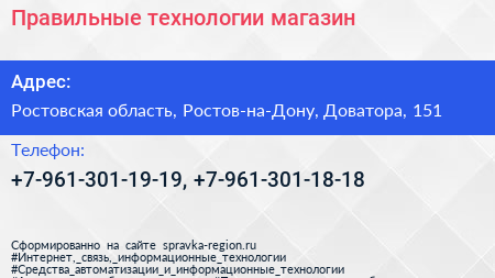 Правильные технологии, магазин по адресу Ростовская область, Ростов-на-Дону, Доватора, 151 в дальнейшем Организация, размещена в следующих категориях: