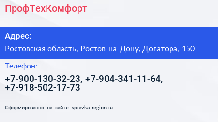 ПрофТехКомфорт по адресу Ростовская область, Ростов-на-Дону, Доватора, 150 в дальнейшем Организация, размещена в следующих категориях: