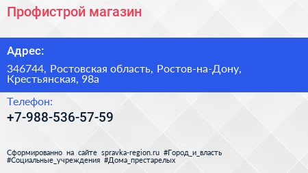 Профистрой, магазин по адресу 346744, Ростовская область, Ростов-на-Дону, Крестьянская, 98а в дальнейшем Организация, размещена в следующих категориях: