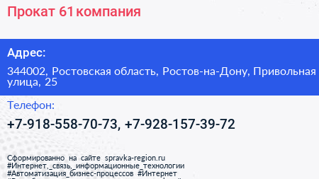 Прокат 61, компания по адресу 344002, Ростовская область, Ростов-на-Дону, Привольная улица, 25 в дальнейшем Организация, размещена в следующих категориях: