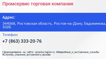 Промсервис, торговая компания по адресу 344068, Ростовская область, Ростов-на-Дону, Евдокимова, 102Б в дальнейшем Организация, размещена в следующих категориях: