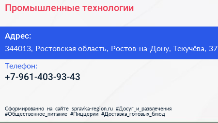 Промышленные технологии по адресу 344013, Ростовская область, Ростов-на-Дону, Текучёва, 37 в дальнейшем Организация, размещена в следующих категориях: