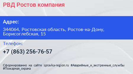 РВД Ростов, компания по адресу 344064, Ростовская область, Ростов-на-Дону, Борисоглебская, 15 в дальнейшем Организация, размещена в следующих категориях: