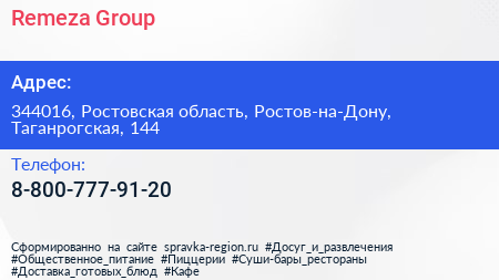 Remeza Group по адресу 344016, Ростовская область, Ростов-на-Дону, Таганрогская, 144 в дальнейшем Организация, размещена в следующих категориях: