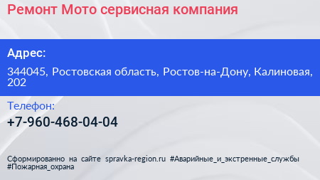Ремонт Мото, сервисная компания по адресу 344045, Ростовская область, Ростов-на-Дону, Калиновая, 202 в дальнейшем Организация, размещена в следующих категориях: