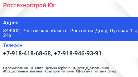 Ростехнострой Юг по адресу 344002, Ростовская область, Ростов-на-Дону, Луговая 1-я, 24а в дальнейшем Организация, размещена в следующих категориях: