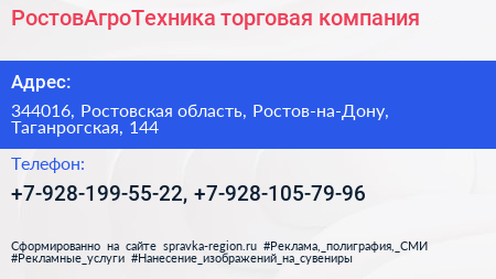 РостовАгроТехника, торговая компания по адресу 344016, Ростовская область, Ростов-на-Дону, Таганрогская, 144 в дальнейшем Организация, размещена в следующих категориях: