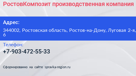 РостовКомпозит, производственная компания по адресу 344002, Ростовская область, Ростов-на-Дону, Луговая 2-я, 6 в дальнейшем Организация, размещена в следующих категориях: