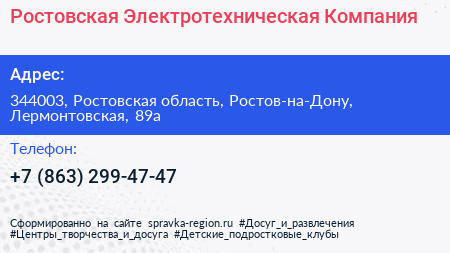 Ростовская Электротехническая Компания по адресу 344003, Ростовская область, Ростов-на-Дону, Лермонтовская, 89а в дальнейшем Организация, размещена в следующих категориях: