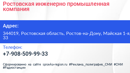 Ростовская инженерно-промышленная компания по адресу 344019, Ростовская область, Ростов-на-Дону, Майская 1-я, 33 в дальнейшем Организация, размещена в следующих категориях: