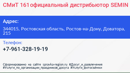 СМиТ 161, официальный дистрибьютор SEMIN по адресу 344015, Ростовская область, Ростов-на-Дону, Доватора, 215 в дальнейшем Организация, размещена в следующих категориях: