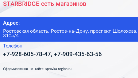 STARBRIDGE, сеть магазинов по адресу Ростовская область, Ростов-на-Дону, проспект Шолохова, 310а/4 в дальнейшем Организация, размещена в следующих категориях: