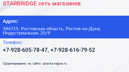 STARBRIDGE, сеть магазинов по адресу 346715, Ростовская область, Ростов-на-Дону, Индустриальная, 25/9 в дальнейшем Организация, размещена в следующих категориях: