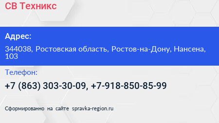 СВ-Техникс по адресу 344038, Ростовская область, Ростов-на-Дону, Нансена, 103 в дальнейшем Организация, размещена в следующих категориях: