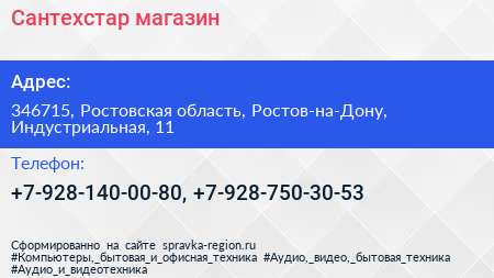 Сантехстар, магазин по адресу 346715, Ростовская область, Ростов-на-Дону, Индустриальная, 11 в дальнейшем Организация, размещена в следующих категориях: