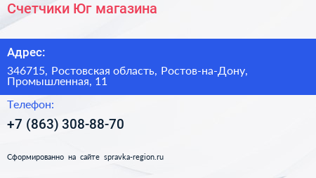 Счетчики-Юг, магазина по адресу 346715, Ростовская область, Ростов-на-Дону, Промышленная, 11 в дальнейшем Организация, размещена в следующих категориях: