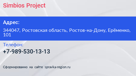 Simbios Project по адресу 344047, Ростовская область, Ростов-на-Дону, Ерёменко, 101 в дальнейшем Организация, размещена в следующих категориях: