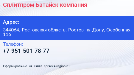 Сплитпром Батайск, компания по адресу 344064, Ростовская область, Ростов-на-Дону, Особенная, 116 в дальнейшем Организация, размещена в следующих категориях: