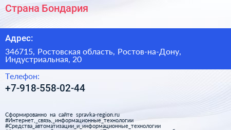 Страна Бондария по адресу 346715, Ростовская область, Ростов-на-Дону, Индустриальная, 20 в дальнейшем Организация, размещена в следующих категориях: