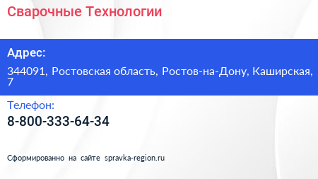 Сварочные Технологии по адресу 344091, Ростовская область, Ростов-на-Дону, Каширская, 7 в дальнейшем Организация, размещена в следующих категориях: