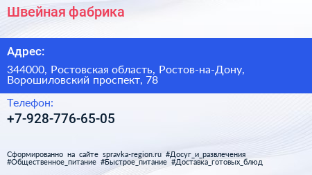Швейная фабрика по адресу 344000, Ростовская область, Ростов-на-Дону, Ворошиловский проспект, 78 в дальнейшем Организация, размещена в следующих категориях: