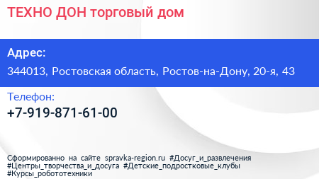 ТЕХНО-ДОН, торговый дом по адресу 344013, Ростовская область, Ростов-на-Дону, 20-я, 43 в дальнейшем Организация, размещена в следующих категориях: