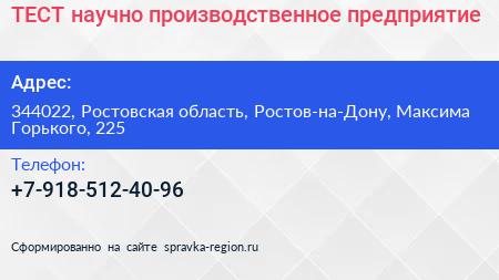 ТЕСТ, научно-производственное предприятие по адресу 344022, Ростовская область, Ростов-на-Дону, Максима Горького, 225 в дальнейшем Организация, размещена в следующих категориях: