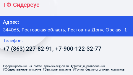 ТФ Сидереус по адресу 344065, Ростовская область, Ростов-на-Дону, Орская, 1 в дальнейшем Организация, размещена в следующих категориях: