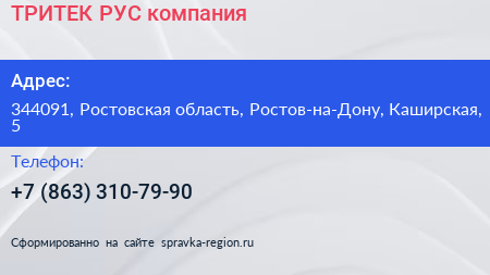 ТРИТЕК РУС, компания по адресу 344091, Ростовская область, Ростов-на-Дону, Каширская, 5 в дальнейшем Организация, размещена в следующих категориях: