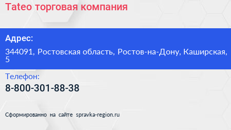 Тateo, торговая компания по адресу 344091, Ростовская область, Ростов-на-Дону, Каширская, 5 в дальнейшем Организация, размещена в следующих категориях: